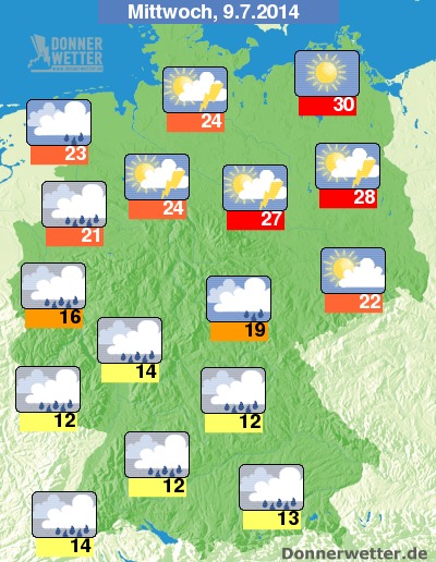Heute erleben wir eine Zweitteilung beim Wetter. Während sich im Norden und Osten bei vielfach schwülwarmen 22 bis 30 Grad häufig Schauer und Gewitter entwickeln, bleibt es im Süden und Westen unter dichten Wolken verbreitet regnerisch und mit 12 bis 21 Grad auch deutlich kühler.