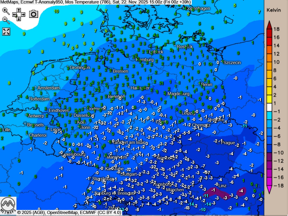 Die Temperaturen / Temperaturabweichung sowie die Wetterkarte für Samstagnachmittag (15:00 Uhr) nach ECMWF: