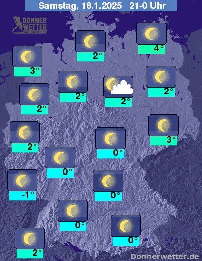 In der Nacht zum Sonntag zeigt sich der Himmel über dem Nordosten wolkig oder gering bewölkt, sonst funkeln die Sterne von einem meist sternenklaren Himmel. Es bleibt trocken.