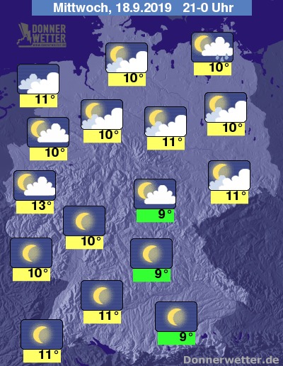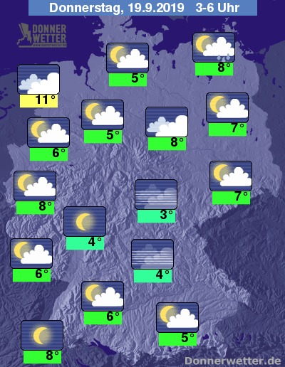 Bis zu den Frühstunden kühlt die Luft auf 3 bis 8 Grad ab. Stellenweise kann es in Mittelgebirgstälern zu leichten Bodenfrösten kommen. Im Emsland, sowie auf den Nordseeinseln halten sich die Temperaturen im etwas milderen zweistelligen Bereich auf.