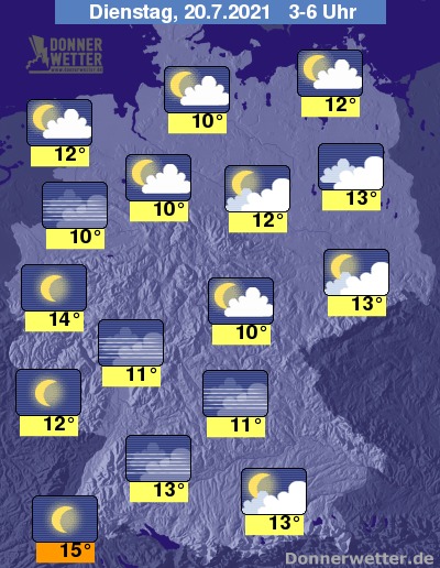 In der kommenden Nacht zeigt sich der Himmel über der Republik zum Großteil sternenklar. Einige, oft auch dichte Wolken halten sich allerdings über dem Norden des Landes und über Sachsen, dazu bleibt es trocken. Die Temperatur sinkt auf 15 Grad in Freiburg und bis 10 Grad in Hamburg.