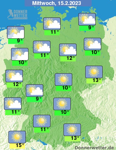 Heute ist es oft heiter bis sonnig, gebietsweise ziehen auch mal ein paar mehr Wolken durch. Es bleibt dazu trocken bei Höchstwerten von 9 Grad in Neubrandenburg und bis zu 15 Grad in Freiburg.