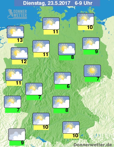 Dazu bekommen wir am Morgen Temperaturen um 6 Grad in Thüringen und 13 Grad im Ostfriesland.
