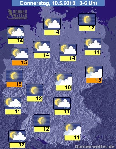 In der Nacht zum Donnerstag klingen Schauer und Gewitter meist rasch ab, besonders am Alpenrand und im Südwesten sind jedoch bis zum Morgen hin weitere Schauer und Gewitter möglich, sonst ist es oft locker bis wechselnd bewölkt, zum Teil ist der Himmel auch sternenklar, dazu bleibt es dann weitgehend trocken. Die Temperatur sinkt auf milde 15 Grad in Dresden und bis 10 Grad im Grabfeld.