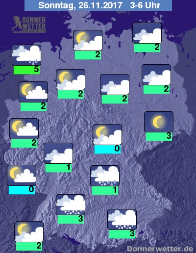 In der Nacht zum Sonntag fällt im Süden unter bedecktem Himmel zeitweise Regen, Schneeregen oder Schnee, dazu besteht Glättegefahr! Sonst ist es meist leicht bis aufgelockert, vor allem an den Küsten und im Osten auch oft stark bewölkt, jedoch mit Ausnahme der Nordsee weitgehend trocken. An der Nordsee sind einzelne Schauer möglich. Die Temperatur sinkt auf 5 bis 0 Grad.