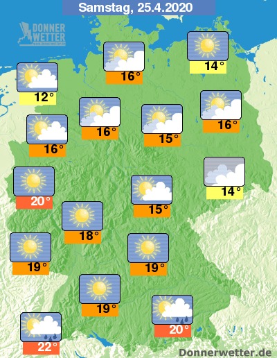 Heute zeigt sich das Wetter oft heiter bis sonnig, gebietsweise ist es aber auch stark bewölkt. Am Alpenrand bilden sich örtliche Schauer, dagegen bleibt es im übrigen Bundesgebiet weitgehend trocken. Die Temperatur steigt auf teils nur 12 Grad an der Nordsee und bis 22 Grad im Breisgau.