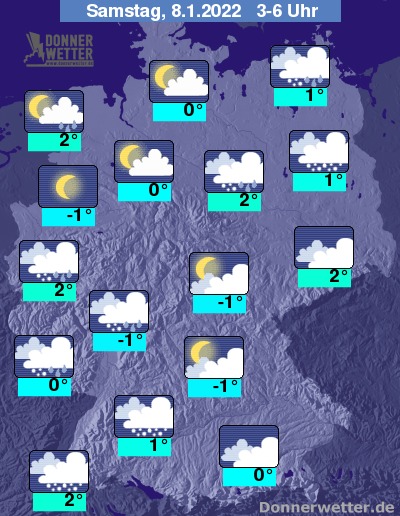 In der Nacht zum Samstag klart der Himmel im Nordwesten Deutschlands verbreitet auf, dazu bleibt hier meist trocken. Ansonsten bleibt es aber überwiegend stark bewölkt oder bedeckt und es fällt auch gebietsweise Schnee, Schneeregen oder Regen. Die Temperatur sinkt auf 2 Grad am Rhein und bis -1 Grad im Grabfeld. An den Küsten weht weiterhin stürmischer Wind, teils herrscht Sturm.