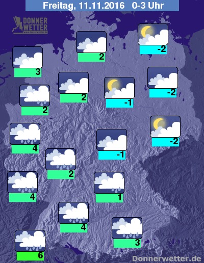 In der Nacht erfasst dann ein neues Niederschlagsgebiet den Süden und Westen des Landes. Zwischen Niederrhein und Berchtesgadener Land regnet und schneit es mitunter kräftig. Die Tiefstwerte liegen zwischen -2 Grad entlang der Polnischen Grenze und 6 Grad in Baden.