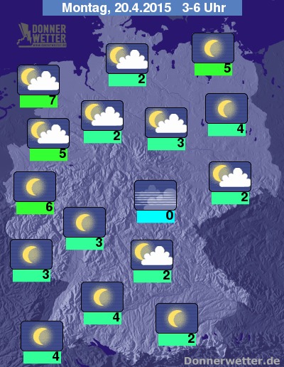 In der folgenden Nacht ziehen in einem sehr breiten Streifen vom Nordwesten Deutschlands bis in den Osten des Landes oft lockere Wolken durch. Sowohl nordöstlich als auch südwestlich dieses Bandes bleibt es hingegen verbreitet sternenklar. Bei Tiefstwerten zwischen 7 Grad an der Nordsee und 0 Grad im Vogtland bleibt es überall trocken.