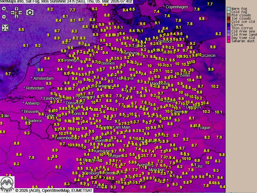 Die Temperatur- und Wetterkarte für 15:00 Uhr sowie das Falschfarben-Meteosatbild mit Saharastaub (pinke Flächen) und 24-Stunden-Sonnenscheindauer nach ICON: