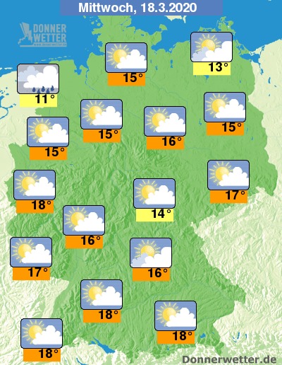 Heute ist es im Norden verbreitet stark bewölkt und in Küstennähe fällt auch zeitweise Regen. Im übrigen Bundesgebiet zeigt sich das Wetter hingegen meist heiter bis sonnig, nur hier und da ziehen einige Wolken durch, dabei bleibt es trocken. Die Temperatur steigt auf 11 Grad in Aurich und bis 18 Grad in Augsburg.