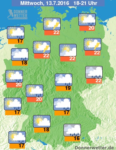 Heute Abend ist es nach Südosten hin bedeckt und es fällt oft langanhaltender Regen. Im übrigen Land zieht teils aufgelockerte, häufig aber starke Bewölkung durch und es können sich verbreitet Schauer und auch Gewitter entwickeln. Die Temperatur liegt bei etwa 16 Grad in München und um 22 Grad in Magdeburg.