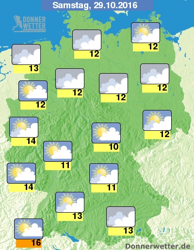 Heute ist es im Norden, aber auch im Süden und Osten häufig stark bewölkt oder trüb, Aufheiterungen sind hier dennoch möglich, zudem bleibt es trocken, sonst zeigt sich das Land oft heiter bis wechselnd bewölkt, im Westen und Südwesten auch sonnig, dazu bleibt es trocken. Die Temperatur steigt auf recht milde 10 bis 16 Grad.