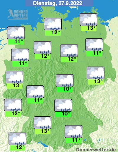 Am Dienstag ziehen überwiegend dichte Wolken durch, kurze Auflockerungen sind mal hier und da möglich. Es bilden sich wiederholt Schauer bei 10 Grad in Nürnberg und bis 13 Grad in Bonn.
