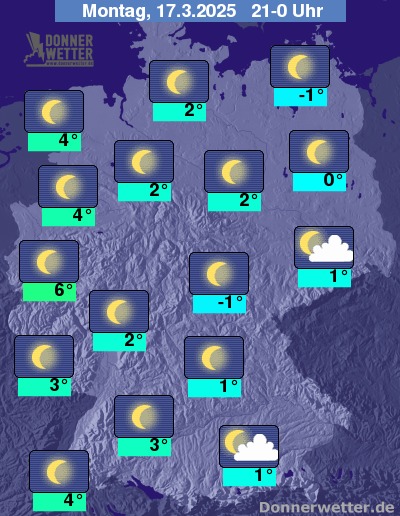 In der Nacht zum Dienstag zeigt sich der Himmel über den Alpen zunächst noch wolkig, sonst ist es meist sternenklar, lokal kann sich im Nachtverlauf auch Nebel bilden. Es bleibt niederschlagsfrei.
