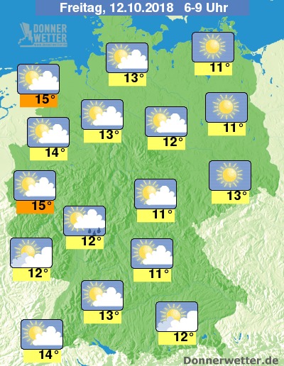 Die Temperaturen sinken auf Werte um 15 Grad C entlang des Rheins und um 11 Grad C im Thüringer Wald.