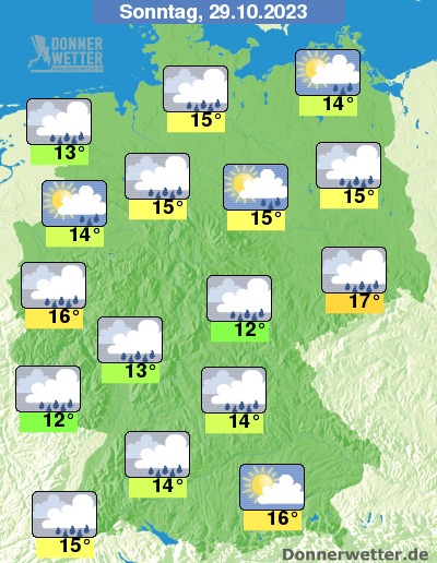 Am Sonntag ziehen oft dichte Wolken durch und es fällt vielerorts Regen, vorübergehend kann es aber auch aufheitern. Die Temperatur steigt auf 12 Grad im Saargau und bis 17 Grad in der Lausitz. Im Norden weht ein oft starker bis stürmischer Wind. An der Nordsee herrscht zum Teil Sturm.
