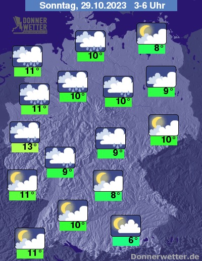 In der Nacht zum Sonntag ist es im Süden und zunächst auch im Osten oft aufgelockert bewölkt und dazu auch trocken. Im übrigen Land ist es schon meist bedeckt und von Westen her setzt im Verlauf zeitweiliger Regen ein. Die Temperatur sinkt auf 13 Grad in Köln und etwa 6 Grad in München.