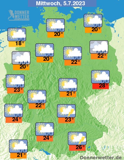 Am Mittwoch zeigen sich zum Teil heitere Abschnitte, teils ziehen jedoch dichte Wolken durch, dabei bilden sich mögliche Schauer, im Süden auch Gewitter. Die Temperatur steigt auf 18 Grad an der Nordsee und bis zu 28 Grad an der Neiße.