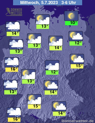 In der Nacht zum Mittwoch ist der Himmel zunächst verbreitet locker bis aufgelockert und nur teils auch stärker bewölkt, dazu bleibt es noch weitgehend trocken. Im Laufe der zweiten Nachthälfte ziehen kompakte Wolken mit teils kräftigen Schauern und Böen in die westlichen Landesteile. Über der Osthälfte bleibt es bis zum Morgen noch trocken. Die Temperatur sinkt auf 16 Grad in Köln und bis 10 Grad in Neubrandenburg.
