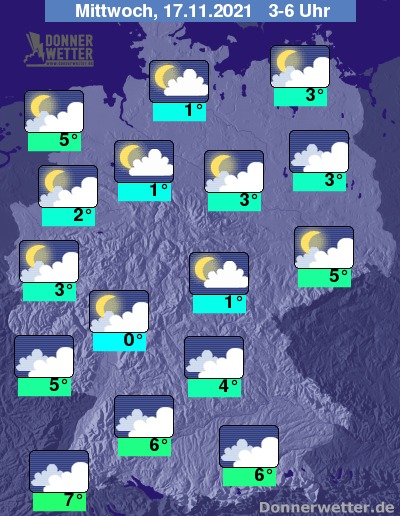In der folgenden Nacht bleibt es über dem Süden weitgehend bedeckt, sonst ist es oft locker bis aufgelockert, teils aber ebenso dicht bewölkt. Es bleibt trocken bei Tiefstwerten von 7 Grad in Freiburg und bis 0 Grad in Wiesbaden. Stellenweise bildet sich Nebel, dabei besteht die Gefahr von Reifglätte!