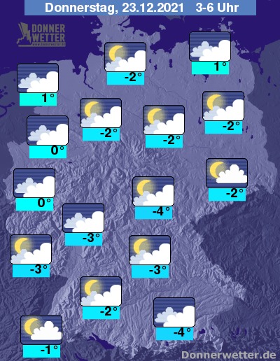 In der Nacht zum Donnerstag lockert es hier und da etwas auf, häufig bleibt es aber stark oder dicht bewölkt. Es fallen nur selten mal ein paar Flocken, zumeist bleibt es trocken. Die Temperatur sinkt auf 1 Grad an den Küsten und bis etwa -4 Grad im Vogtland.
