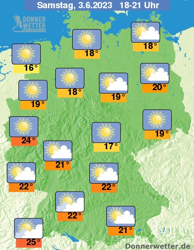 Heute Abend können im Süden gebietsweise einige, teils dichtere Quellwolken aufziehen, sonst ist es aber verbreitet sonnig oder nur locker bewölkt. Es bleibt trocken bei Werten von 16 Grad in Bremerhaven und bis 25 Grad in Freiburg.