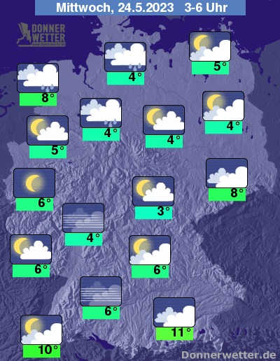 In der Nacht ziehen im Norden dichte Wolken mit Regen auf. Etwas Regen ist bei dichten Wolken auch im Alpenvorland möglich. Im übrigen Land ist es oft locker bewölkt bis sternenklar, hier und da sind auch mehr Wolken unterwegs, dazu bleibt es trocken. Die Temperatur sinkt auf 11 Grad in München und 3 Grad in Jena.
