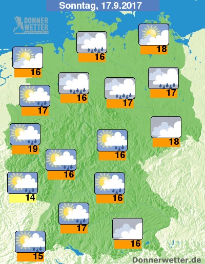 Am Sonntag ziehen vor allem über den Norden Deutschlands oft kompakte Wolken und es bilden sich wiederholt Schauer und auch mögliche Gewitter. Vom Süden bis zur breiten Landesmitte ist es meist sehr wechselhaft mit heiteren Abschnitten und teils dichten Wolken und einzelnen Schauern, örtliche Gewitter sind auch hier möglich. Die Temperatur liegt zwischen 14 Grad im Saargau und 19 Grad im Rheinland.