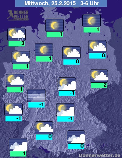 In der kommenden Nacht bleibt es im Süden und teils auch im Osten weiterhin meist stark bewölkt und dabei trocken. In der Nordwesthälfte des Landes ist es verbreitet locker bewölkt oder sternenklar, gebietsweise ziehen jedoch auch einige dichtere Wolken durch. Mit Ausnahme des Nordseeumfelds bleibt es trocken. Stellenweise bildet sich Nebel oder Hochnebel. Die Tiefstwerte liegen bei 3 Grad in Bremerhaven und um -1 Grad am Spessart.
