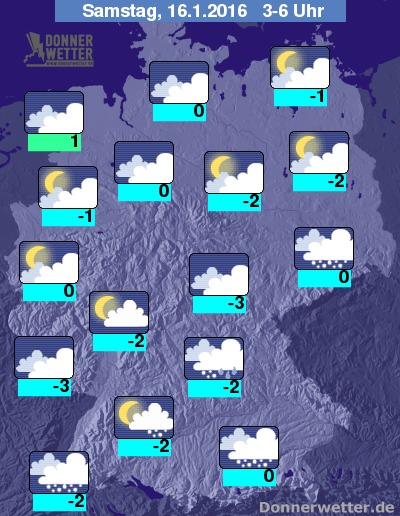 In der folgenden Nacht fällt im Alpenvorland häufig Schnee, auch im übrigen Süden sowie in Sachsen kann hier und da noch Schnee fallen. Es besteht entsprechende Glättegefahr! Im übrigen Bundesgebiet ist es oft stark, vor allem in einem breiten Streifen von Hessen bis nach Berlin-Brandenburg auch oft aufgelockert bewölkt, dazu bleibt es weitgehend trocken. Die Temperatur sinkt auf 1 Grad in Wittmund und etwa -3 Grad im Saargau.