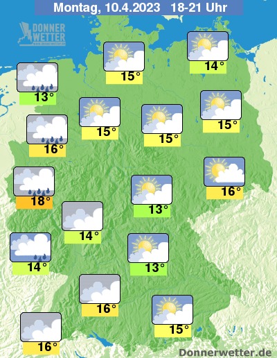 Heute Abend werden die Wolken nach Westen hin noch kompakter und es setzt Regen ein, der langsam weiter bis in die Mitte Deutschlands vorankommt. Über der Osthälfte ist es noch oft wechselnd bis aufgelockert, teils aber auch schon stark bewölkt, allerdings noch trocken. Die Temperatur liegt bei 13 Grad in Nürnberg und bis zu 18 Grad in Köln.