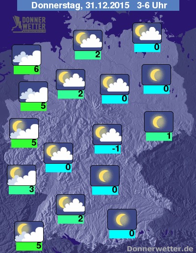 In der kommenden Nacht bleibt es im Osten und Südosten bis zum Morgen meist sternenklar, im Norden und Westen ist es zunächst meist locker bis aufgelockert bewölkt und trocken. Im Laufe der zweiten Nachthälfte ziehen dort zunehmend dichte Wolken auf und gegen Morgen setzt in den westlichen Landesteilen Regen ein, der sich bis zu einer Linie vom Schwarzwald bis zur Nordsee ausbreitet, weiter nach Osten bleibt es noch trocken. Die Temperatur sinkt auf 6 Grad in Ostfriesland und bis etwa -1 Grad im Grabfeld. An den deutschen Küsten weht ein oft starker und teils stürmischer Wind.