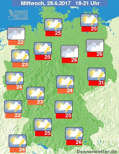 Heute Abend sind zum Teil heitere Abschnitte, teils aber auch kompakte Wolken möglich, es bilden sich gebietsweise, vor allem im Süden auch häufige Schauer und örtliche, teils kräftige Gewitter. Die Temperatur liegt bei 22 Grad in Emden und bis 31 Grad in Dresden.