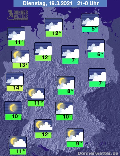 In der Nacht auf Mittwoch ist der Himmel über der Südhälfte und der Mitte meist locker bewölkt, teils auch sternenklar. Gebietsweise kann sich in den frühen Morgenstunden Nebel bilden. In den übrigen Landesteilen überwiegt starke Bewölkung, es bleibt aber meist niederschlagsfrei.