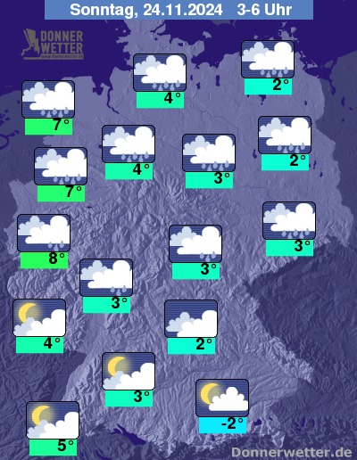 Die Temperaturen erreichen in den frühen Morgenstunden Werte um 8 Grad in der Kölner Bucht, um -2 Grad am Alpenrand.