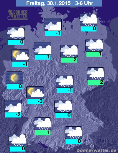 In der folgenden Nacht ist es zunächst weitgehend bedeckt und es fällt häufig Schnee, Schneeregen oder Regen, wobei die Niederschläge zunehmend als Schnee fallen. Dazu kann es oft glatt auf den Straßen werden. Im weiteren Nachtverlauf lockert die Bewölkung im Westen auf und es bleibt nachfolgend trocken. Gebietsweise wird es dabei sternenklar. Die Temperatur sinkt auf 2 Grad in Leipzig und bis -3 Grad am Westerwald.