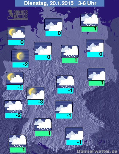 In der folgenden Nacht fällt in einem breiten Streifen von Südwest- bis nach Nordostdeutschland zeitweise Schnee, gebietsweise auch Schneeregen oder Regen, dabei ist Vorsicht auf den Straßen geboten. Südöstlich des Niederschlagbandes ist es ebenfalls stark bewölkt, jedoch trocken, nordwestlich hingegen ist es oft locker oder aufgelockert bewölkt, teils auch sternenklar und weitgehend trocken. Die Temperatur sinkt auf 1 Grad in Rostock und bis -3 Grad am Taunus.