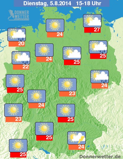 Heute Nachmittag zeigt sich verbreitet die Sonne von einem vielfach blauen Himmel. Deutlich mehr und auch dichtere Wolken sind gebietsweise im Norden und am Alpenrand, teils auch im Osten unterwegs, hier sind da und dort einzelne Schauer und Gewitter möglich, sonst sollte es aber weitgehend trocken bleiben. Die Temperatur liegt bei 20 Grad an der unteren Ems und 27 Grad an der Müritz.