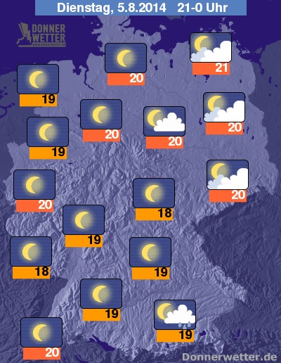 Heute Abend zeigt sich über Deutschland ein verbreitet sternenklarer Himmel, teils dichte Wolken halten sich noch im Nordosten und auch im Südosten des Landes, hier ist der ein oder andere Schauer möglich, sonst bleibt es aber weitgehend trocken. Die Abendtemperatur liegt bei 21 Grad in Görlitz und etwa 18 Grad am Pfälzer Wald.