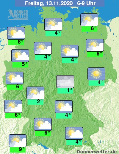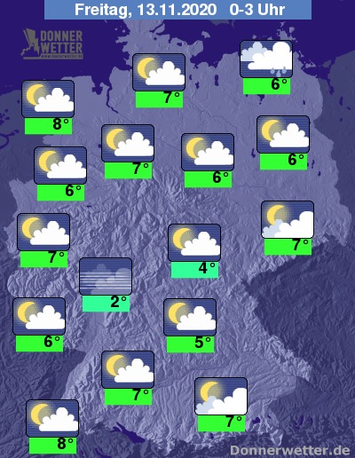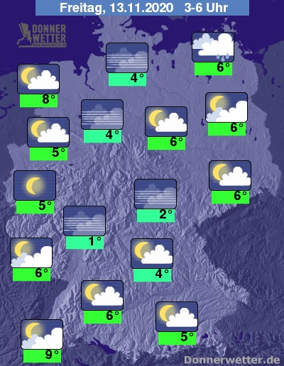 Bis zu den Frühstunden kühlt die Luft auf 8 bis 0 Grad ab. In den Mittelgebirgen sowie in Alpentälern kann es auch zu leichten Frösten oder Bodenfrösten kommen. Am mildesten bleibt es an der Emsmündung und im Markgräflerland.