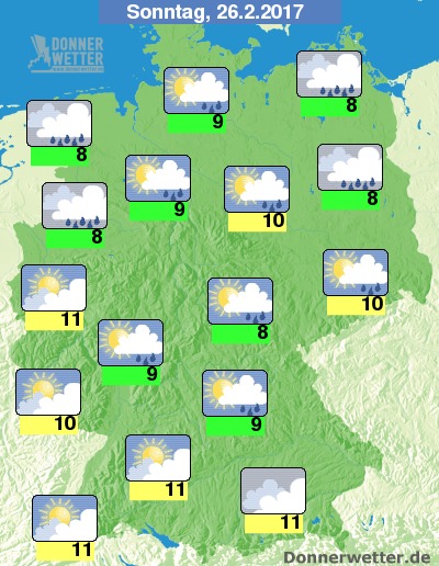 Am heutigen Karnevalssonntag zeigt sich das Wetter nicht unbedingt narrenfreundlich. Besonders über dem Norden bleiben die Wolken meist dicht und es fällt häufig Regen. In den übrigen Landesteilen kann sich neben dichten Wolken mit möglichem Regen auch immer wieder mal die Sonne blicken lassen. Am Alpenrand bleibt es meist bedeckt, aber weitgehend trocken. Die Temperatur steigt auf eher milde 8 bis 11 Grad.