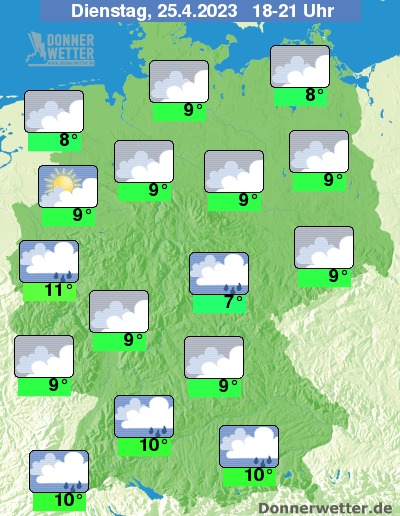 Heute Abend bilden sich im Alpenvorland unter dichten Wolken weitere Schauer. Im übrigen Land bleibt es zwar verbreitet stark bis dicht bewölkt, jedoch klingen die Schauer mehr und mehr ab. Die Temperatur liegt bei 7 Grad im Vogtland und 11 Grad im Rheinland.