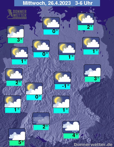 In der Nacht zum Mittwoch sind an den bayerischen Alpen bei dichten Wolken noch einige Tropfen möglich. An der See sind örtliche Schauer möglich. Im übrigen Bundesgebiet lockert und klart der Himmel verbreitet auf und es bleibt trocken. Die Temperatur sinkt auf 5 Grad in Freiburg und -1 Grad in Jena.
