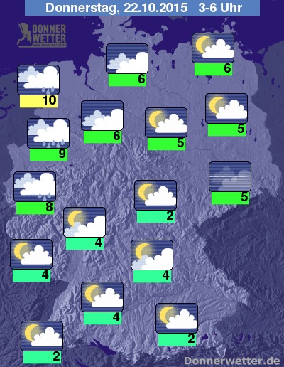 Am Donnerstag ist es anfangs im Süden und Osten noch oft locker oder aufgelockert bewölkt und trocken. Im übrigen Bundesgebiet ziehen hingegen schon verbreitet dichte Wolken durch und es fällt zeitweise Regen. Im Tagesverlauf breiten sich die Regenwolken auch auf die übrigen Landesteile aus. Die Temperatur steigt auf 8 Grad im Grabfeld und bis 14 Grad im Rheinland.