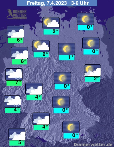 In der folgenden Nacht bleibt es über der Osthälfte Deutschlands verbreitet sternenklar oder es ziehen nur lockere Wolken durch. Weiter nach Westen hin werden die Wolken zunehmend dichter und westlich des Rheins fällt im Laufe der Nacht auch gebietsweise Regen. Im übrigen Land bleibt es trocken bei Tiefstwerten von 7 Grad in Bonn und 0 Grad in Berlin.