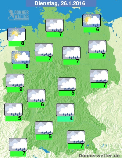 Am Montag bleibt der Himmel im Norden und Osten bedeckt und es fällt zeitweise Regen, über der Südwesthälfte ist es zumeist locker bis aufgelockert bewölkt, zum Teil auch trüb, dabei bleibt es weitgehend trocken. Es werden 4 bis 10 Grad erreicht.