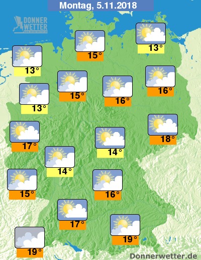Am Montag zeigen sich häufig heitere Abschnitte, teils ziehen auch mehr Wolken durch oder es ist trüb, dabei bleibt es landesweit trocken. Die Temperatur steigt auf 13 Grad an der Ems und bis 19 Grad im Oberrheingraben.