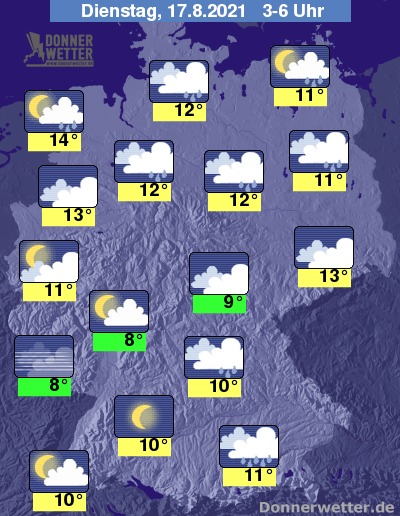 In der Nacht zum Dienstag fällt im Südosten des Landes noch zeitweise Regen, der erst gegen Morgen abklingt, sonst lockert und klart der Himmel über der Südwesthälfte des Landes verbreitet auf und es bleibt trocken. Über der Nordosthälfte bleibt es dagegen stark bewölkt, Auflockerungen sind jedoch möglich, allerdings können sich wiederholt Schauer und selten auch Gewitter bilden. Die Temperatur sinkt auf 14 Grad an der Nordsee und bis 8 Grad im Saargau.