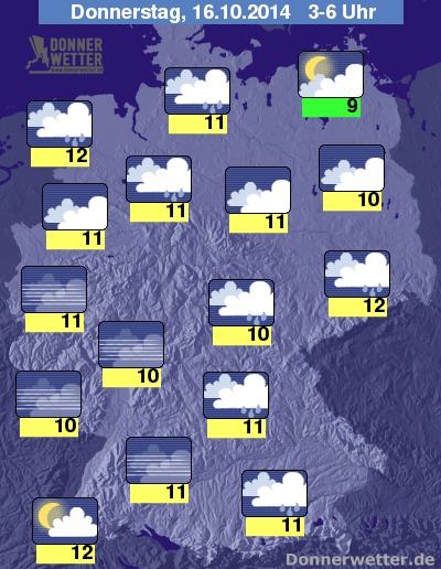 In der folgenden Nacht breiten sich vom Südwesten her dichte Regenwolken weiter nach Nordosten hin aus, sie erreichen bis zum Morgen etwa einen Streifen von Niedersachsen bis nach Sachsen, nordöstlich davon bleibt es meist aufgelockert oder nur locker bewölkt und trocken, jedoch kann sich örtlich Nebel oder Dunst bilden. Im Südwesten des Landes klingt der Regen in der zweiten Nachthälfte nach und nach wieder ab und die Bewölkung lockert zum Morgen hin verbreitet auf, dann ist hier ebenfalls regional mit Nebel oder Dunst zu rechnen. Die Temperatur sinkt auf 12 Grad an der Nordseeküste und bei Aufklaren bis 8 Grad an der Müritz.